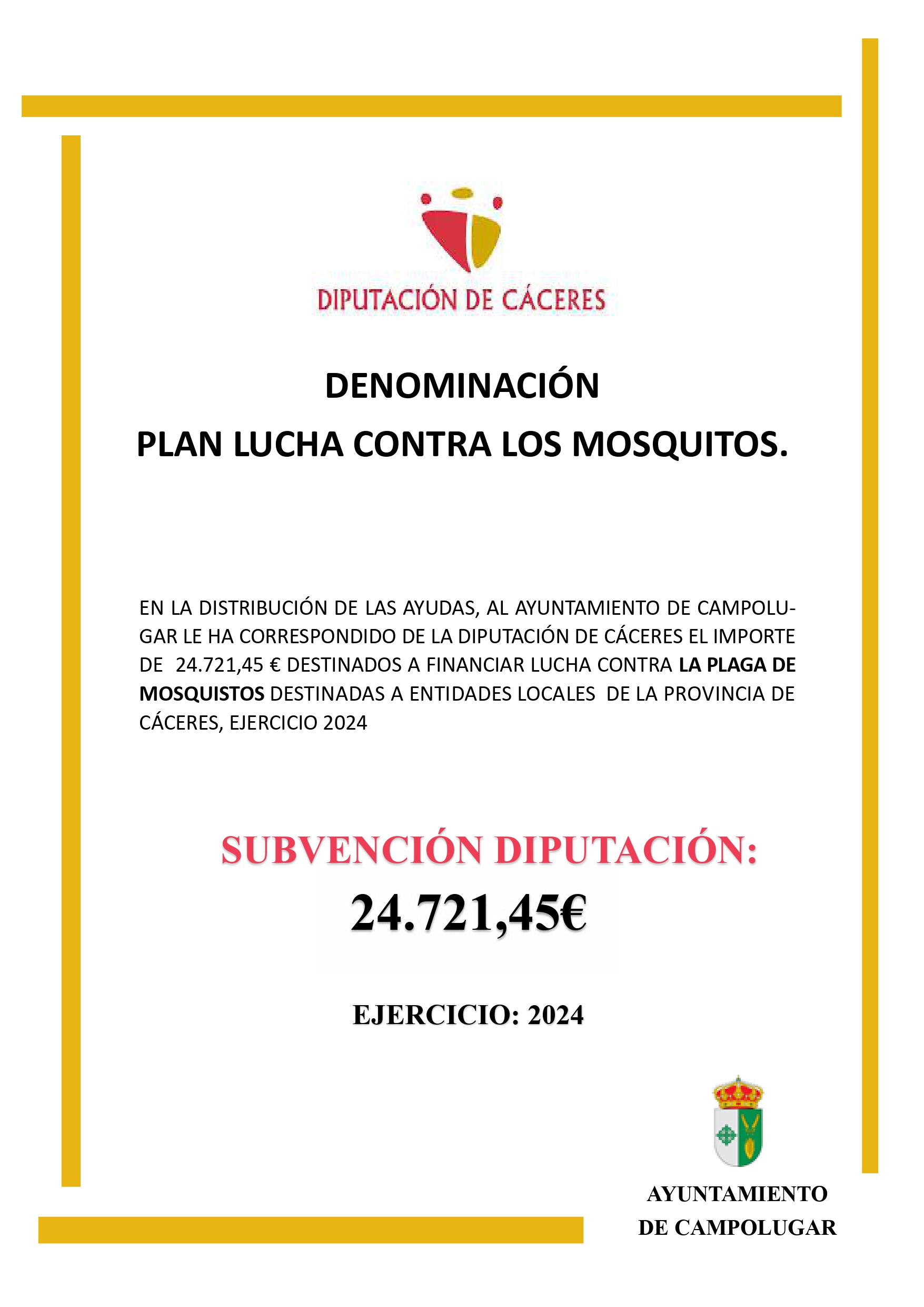EN LA DISTRIBUCIÓN DE LAS AYUDAS, AL AYUNTAMIENTO DE CAMPOLUGAR LE HA CORRESPONDIDO DE LA DIPUTACIÓN DE CÁCERES EL IMPORTE DE 24.721,45 € DESTINADOS A FINANCIAR LUCHA CONTRA LA PLAGA DE MOSQUISTOS DESTINADAS A ENTIDADES LOCALES DE LA PROVINCIA DE CÁCERES, EJERCICIO 2024