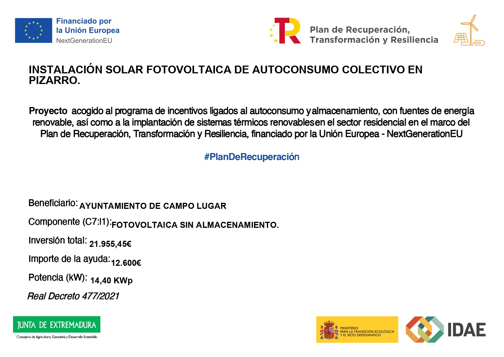 SUBVENCIONES - INSTALACIÓN SOLAR FOTOVOLTAICA DE AUTOCONSUMO COLECTIVO EN PIZARRO.